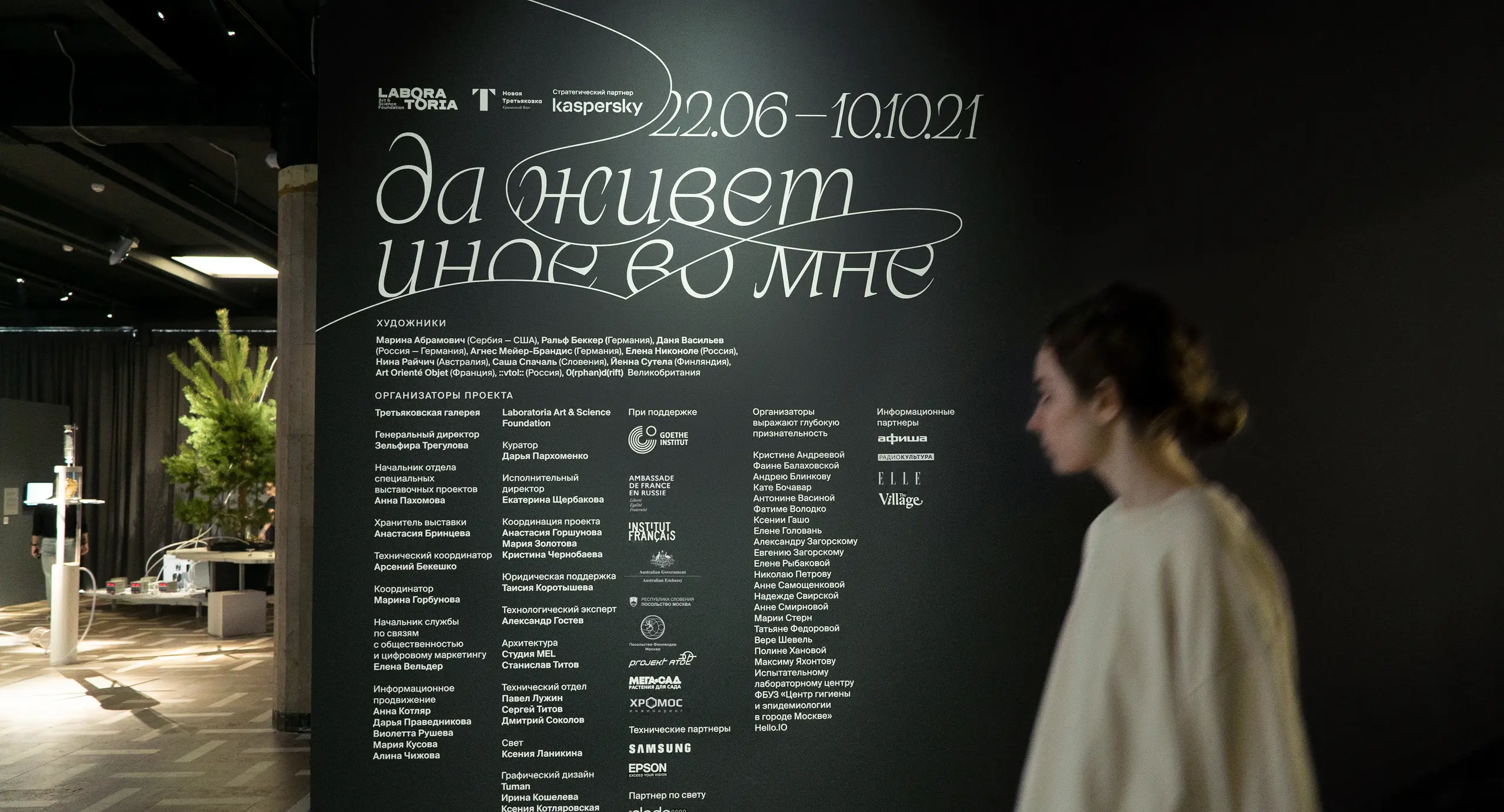 The exhibition was held at the Tretyakov Gallery in the Laboratoria Art & Science space. Among the featured artists were Marina Abramović, Ralf Baecker, Art Orienté objet, Agnes Mayer-Brandis, Saša Spačal, Jenna Sutela, Elena Nikonole, Nina Rajcic, and Danya Vasiliev.